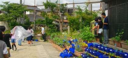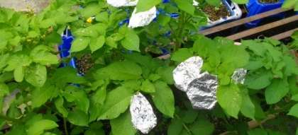 ジャガイモの葉に、アルミホイルをかぶせていますね。