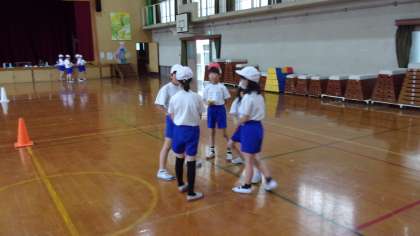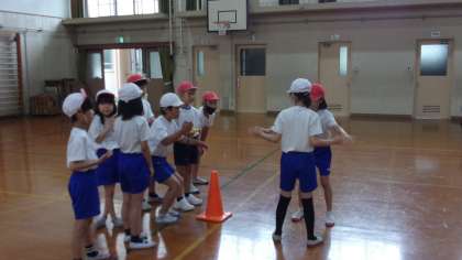 4年生は、体育の学習をしています。どうやったら手おしずもうで勝てるかを話し合って、対戦です。うまくいかせたかな。