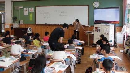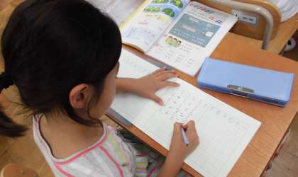 1年生は算数のたし算の学習に取り組んでいます。ノートに、ていねいに書けるかな。