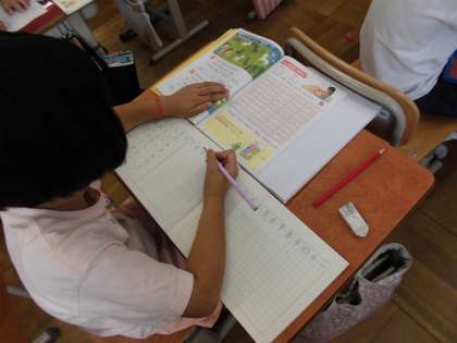 1年生は、算数の学習をしています。たし算の式と答えをノートのマス目をよく見て書いています。