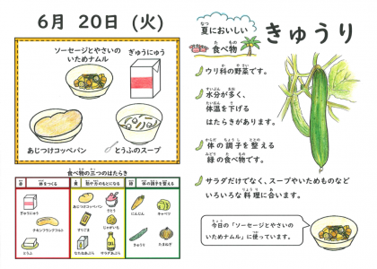 1・2年生はプールの後の給食でした。「ソーセージが4つ入っていたよ」「きゅうりがシャキシャキしました」といった感想をもらいました。暑い日でもさっぱり食べられていたようです。