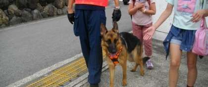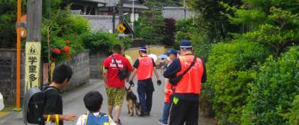 今日は警察犬もいっしょに見守り活動を進めて頂きました。今日は学校の南側方面を順次巡回していただきました。