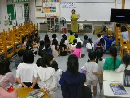 中間休みに学校図書館司書の先生による読み聞かせがありました。
