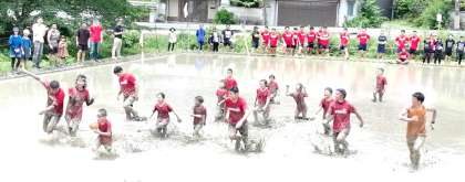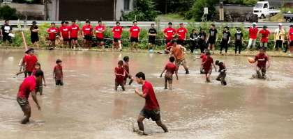 水田の中に作ったフィールドで、各チームがラグビーボールを相手のゴールラインまで運んで得点を競います。通常のラグビーとは異なり、タックル等のコンタクトプレーはなく、ボールを持っている相手の体をタッチして動きを止めるルールになっています。