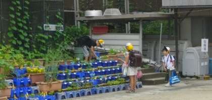 毎朝、トマトの苗やひまわりに水をやっています。