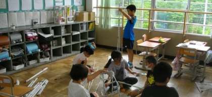 4年生の図画工作科の時間の様子です。新聞紙を筒状にして、どんどんつなげています。