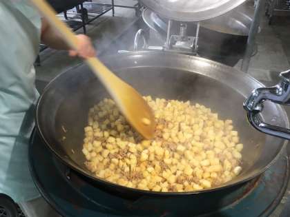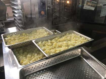 豚肉のケチャップ煮に使うじゃがいもは、スチコンで蒸してからトマトケチャップ・さとう・ウスターソースで作った特製調味液と合わせました。