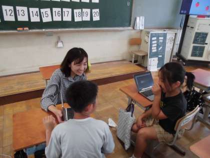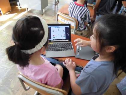 2年生は、タブレットを使って英語で数を数える問題を出し合っています。