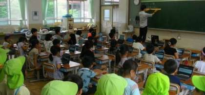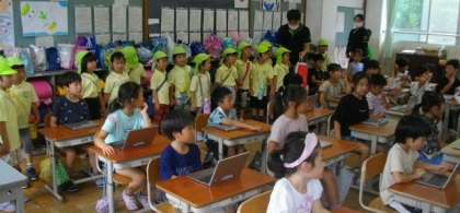 地域の保育園のお友達は、1・2年生の部屋に案内して、学習する様子を参観してもらいました。1、2年生ともタブレット端末を使って学習をしているところでした。