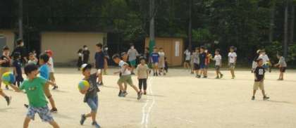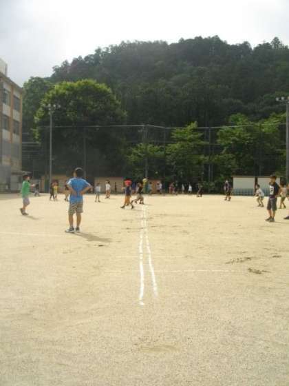運動場の真ん中に、白線(時には水で線を引きます)を引いておくと、それを境にボールを投げ合っています。今日は、2年生のお友達も参加しています。