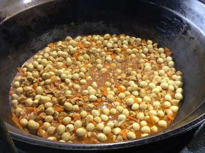 麦ごはん、鶏肉とうずら卵のスパイシーいため、とうふと青菜のスープ、牛乳