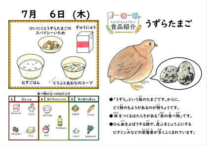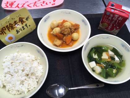 うずら卵がたっぷり入った「鶏肉とうずら卵のスパイシーいため」は、あっさりとしたスープカレーのような味付けで、子どもたちにも大人気でした。今日もおいしい給食をごちそうさまでした。