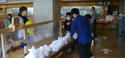 食堂の出口でおにぎり弁当を受け取っています。