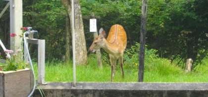 食堂のすぐ近くに、野生のシカがひょっこり顔を出しました。