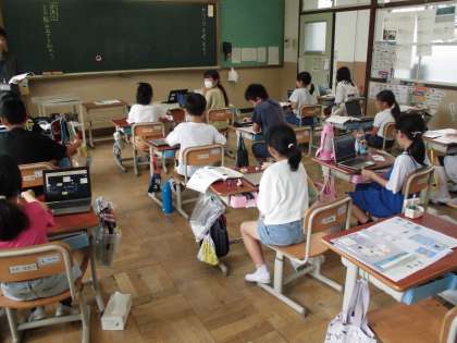 4年生は社会科の学習でグループで祇園祭の今と昔を調べ、発表しています。国語ではわりつけについて考えています。