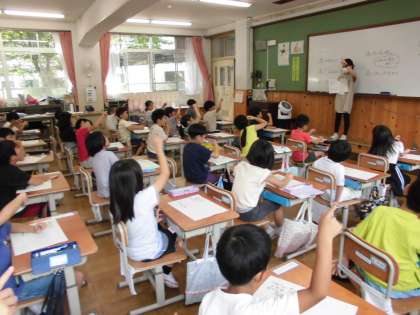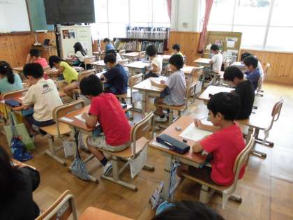 1年生は算数の復習プリントに取り組んでいます。数字の正しい書き方を確認しています。