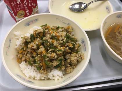 洋風そぼろごはんができました。ピーマンの緑色が映えています。どの学年からも大好評でした。5年生から、「久々の給食は、おいしかった!」とうれしい感想をもらいました。