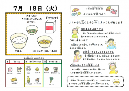給食時間前、6年生の児童が給食室を覗いて「今日は、肉じゃが、しかもカレー味ですね♪」と嬉しそうに話しかけてくれました。じめじめとした暑さの中でしたが、お箸がすすむ献立だったのではないでしょうか。