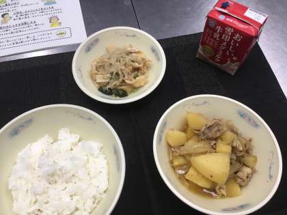 ごはん、肉じゃが(カレー味)、小松菜と切干大根の煮びたし、牛乳