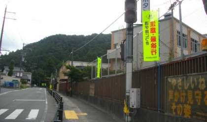 地域の交通安全会の方々にお世話になり、鞍馬街道沿いののぼり旗を新調していただきました。25日(金)から、2学期が始まります。