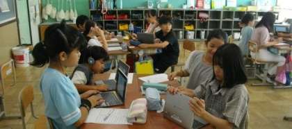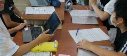 自分がつきたい仕事について調べたことを、グループ内で発表しています。