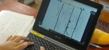 段落ごとにまとめたことを、タブレットの表に入力しています。