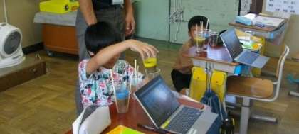 4年生は、理科「雨水のゆくえ」の単元で、土の種類によって水のしみこみ方がどのように違うのかを観察しています。様子を絵にかいたり、文に表したり、タブレットで動画撮影をしたりするなど、記録の取り方をそれぞれが工夫をしています。