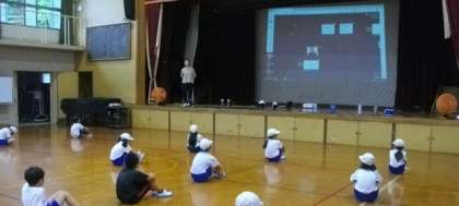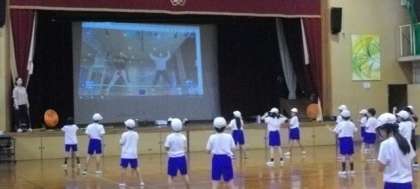 体育館に液晶プロジェクタを常駐することで、ロイロノートや映像資料視聴の機会が日常的になっています。