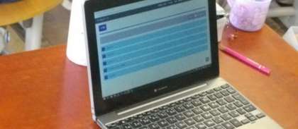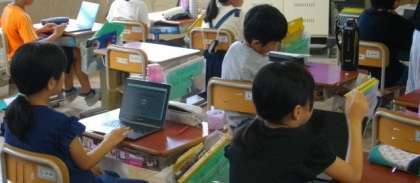 4年生は、始業前に、デジタルドリルで算数の割り算の復習問題に取り組んでいました。