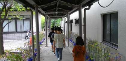 4年生は、整然と一列に並んで静市学習情報センターへ移動しています。
