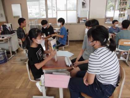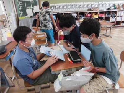 6年生は外国語の学習で夏休みの思い出を発表しました。Do you like〜?Where did you go?など質問し合って話を広げることができました。また、書いたカードを読むのではなく、アイコンタクトを意識して伝えていました。振り返りでも「発表する方も聞く方もどちらも質問することができた。」と言っていました。
