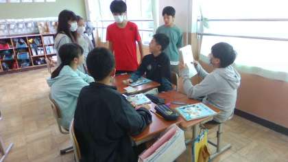 6年生は外国語の学習でI like〜 I have〜 I want〜 I play〜を使って自分の好きなことやほしいものを伝え合いました。そして、グループごとに友だちあてクイズをしました。