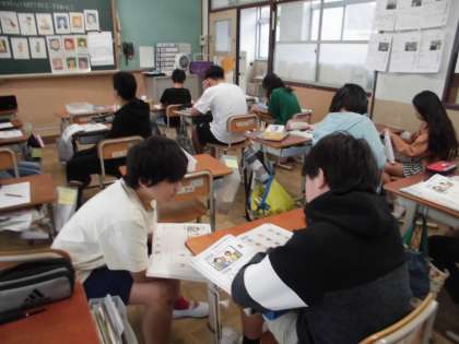 6年生は外国語の学習で職業や性格などを紹介する言い方を学習しました。友だちと教科書に出ている人物の人物当てクイズをしました。