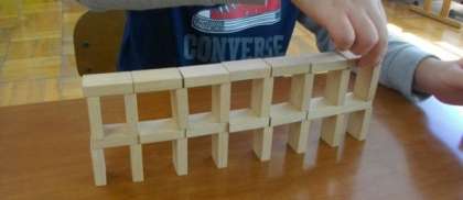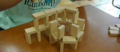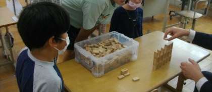 3組では、バランスを考えながら木片を積み上げて作品作りに取り組んでいました。