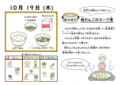 麦ごはん、肉だんごのスープ煮、じゃがいものいためもの、牛乳