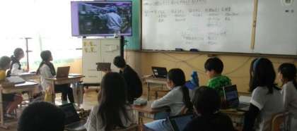 5年生は社会科で自動車が組み立てられる様子を資料で見ながら学習をしています。今日も、鞍馬小学校のお友達がオンライン交流授業で参加しています。