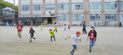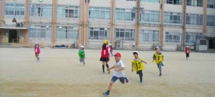 運動場いっぱいに広がって、おにごっこをしています。