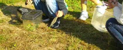 池の横では、2年生が生き物さがしに夢中になっています。