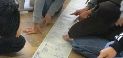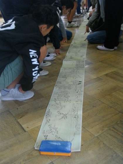 鳥獣戯画をじっくりと見つめて、わかったことや気が付いたことを話し合っています。