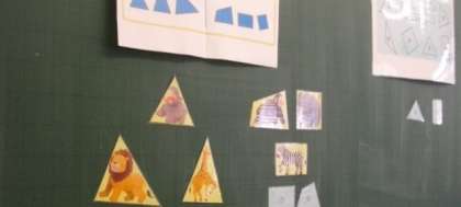 2年生は、算数の時間に、三角形と四角形を見つけています。