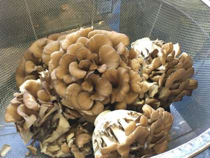 きのこのクリームシチューに使用するまいたけの下処理をしています。肉厚で立派なまいたけが納品されました。生のしいたけ、えりんぎもおいしそうです。