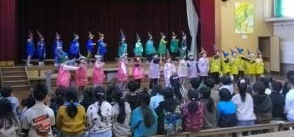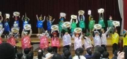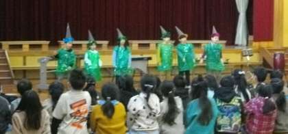 3年生が魔法使いになって、魔法の音楽をかけました。黒い帽子に、カラフルな衣装を身にまとい、歌詞に合わせた振りをグループごとに考えて披露しました。魔法の音楽で、楽しいパーティーになりました。