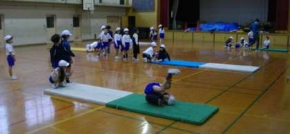 3年生はサッカーを2年生はマット運動を学習しています。