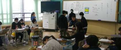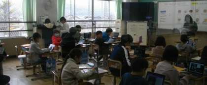 1組は、外国語科の学習、2組は書写で四字熟語の漢字を書いています。