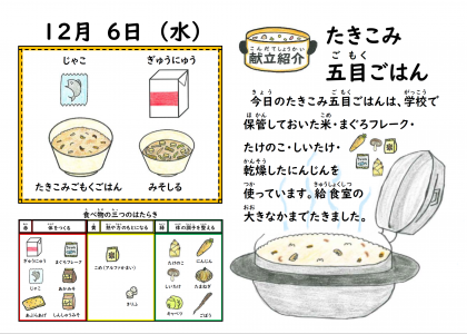 今日は、学校で保管しておいたα化米を使った、炊き込みごはんが提供されました。味噌汁には、長期保存のきく乾燥野菜や缶詰を使っています。1月・2月にもこうした給食が提供される予定です。