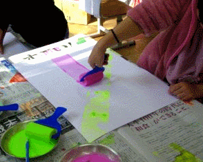 1年生がスタンプやローラーを使った作品作りに取り組んでいます。