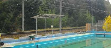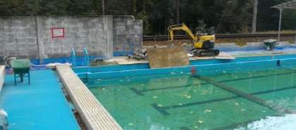 プールのブロック塀を撤去しています。この個所は、特に頑丈な作りになっているので重機をフル稼働しています。