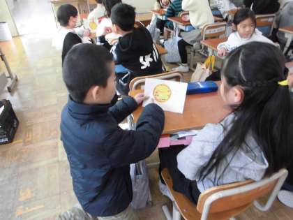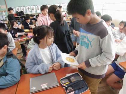 4年生は外国語の学習で事前に渡す相手に好きな野菜をインタビューし、ピザを作りました。1組は3年生、2組は2年生の友達に作ったピザを紹介し、プレゼントしました。4年生が目線を合わせて丁寧に紹介する様子がとても微笑ましかったです。2年生にも3年生にも「おいしそう!」と喜んでもらえました。