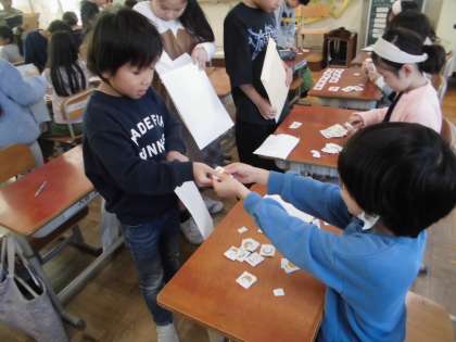 2年生は英語活動でサラダを作るためにほしい野菜や数を尋ね合いました。お店屋さんとお客さんに分かれて、Tomato please. How many? Three please. Here you are. Thank you.などやりとりをしました。とても楽しんで活動していました。