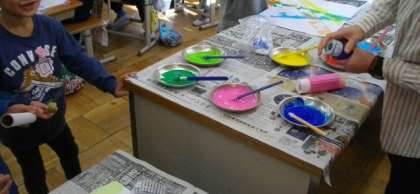 1年生は、スタンプを使って作品作りに取り組んでいます。